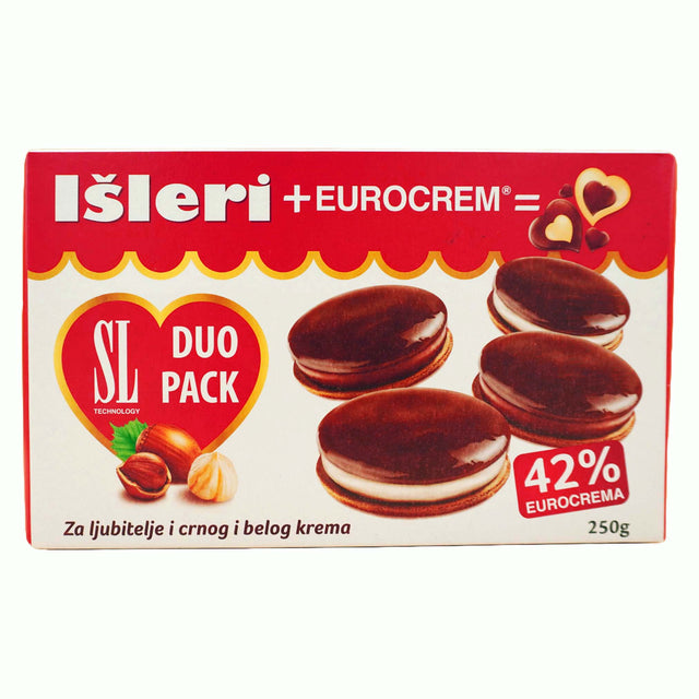 Genieße den klassischen Geschmack von Serbien mit Isleri + Eurocrem DUO Swisslion 250g. Perfekt für den Fernsehabend, eine Tasse Tee oder Kaffee oder für unterwegs. Knackige Kekse gefüllt mit cremigem Eurocrem bringen Abwechslung in deinen Alltag.